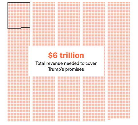This figure, the editorial board adds, is more than 22 times the $264 billion that the Treasury raised in tariff revenue in 2025. (This amount is depicted by the thick black lines in the visuals below, where each square represents $1 billion).